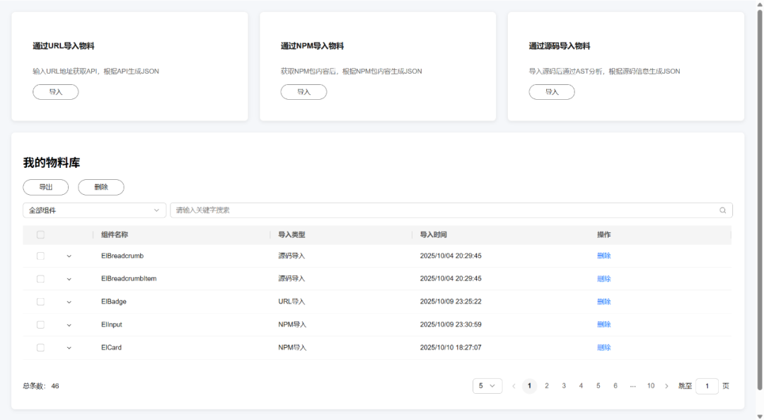 - 主表展示基础信息(组件名、导入类型、导入时间等);