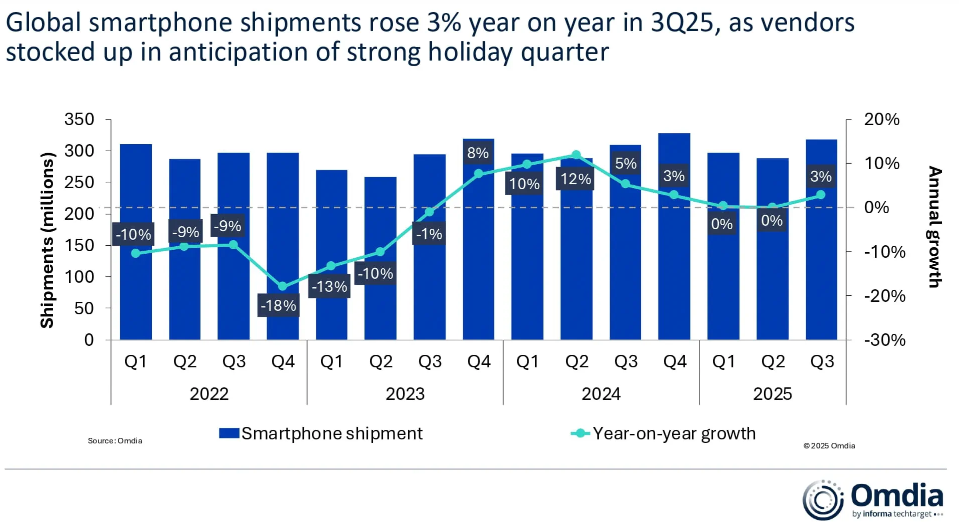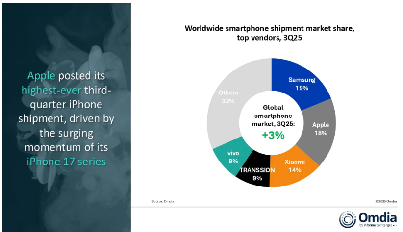 Omdia的最新研究显示,全球智能手机市场在第三季度同比增长3%,标志着该季度主要产品发布推动的增长势头回归。强劲的更换需求,以及几家供应商在繁忙的25年第四季度之前准备跨渠道库存,推动了这一反弹。三星连续第三个季度保持了19%的市场份额,这得益于其Galaxy a系列的持续销量强劲以及升级的第七代可折叠产品组合。苹果的iPhone出货量增长了4%,实现了有史以来最强劲的第三季度业绩,iPhone 17系列的早期需求帮助其获得了18%的市场份额。小米以14%的市场份额稳居前五,传音和vivo各占9%的市场份额。