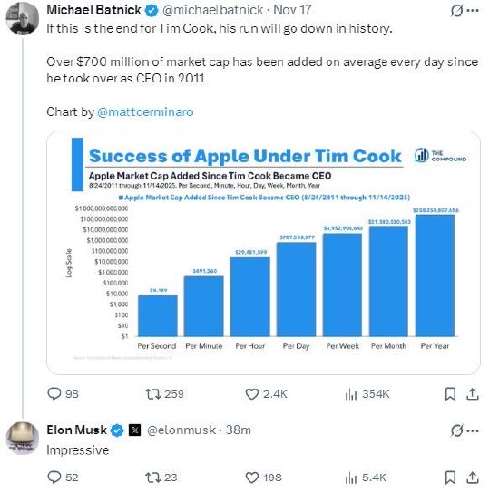 该用户评论称:“如果这是蒂姆·库克时代的终结,那么他的成就将被载入史册。”