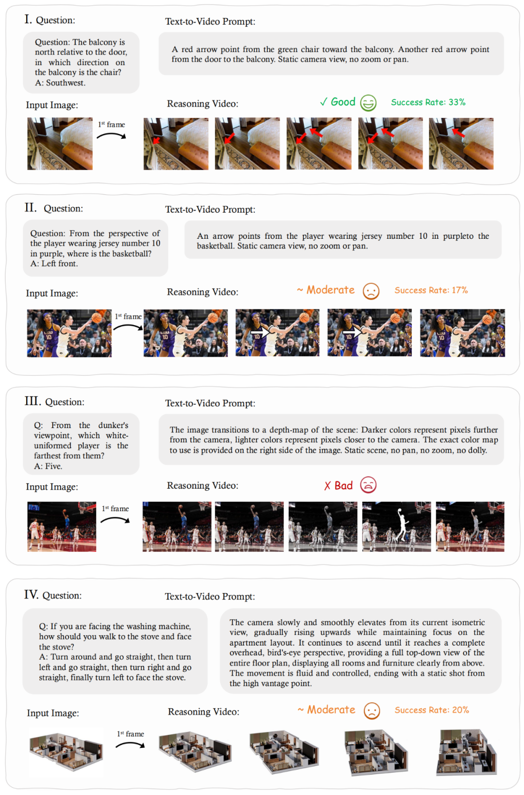 提示式设计创新:将抽象推理任务(如物理、几何、计数)转化为可视化视频生成挑战,迫使模型通过 “帧链推理” 展现过程性思考。