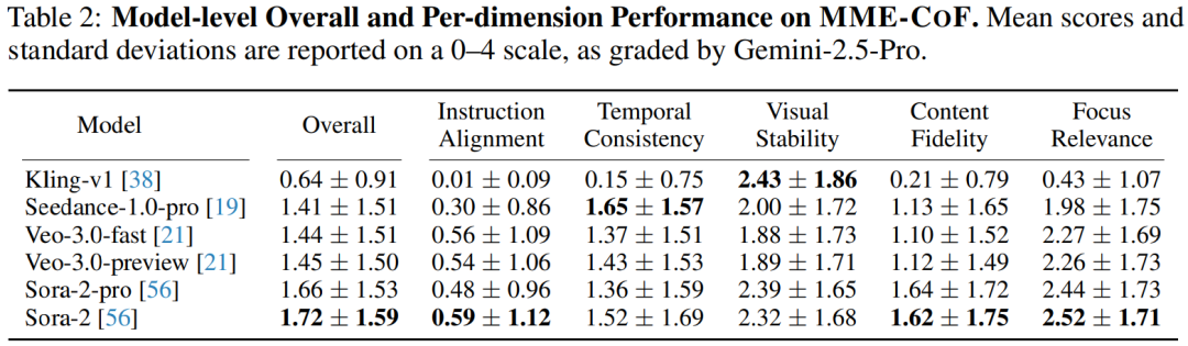 下表展示了多种视频生成模型在 MME-CoF 基准上的评测结果,评分由 Gemini-2.5-Pro 完成,量表范围为 0–4。研究团队从五个维度进行评估。整体来看,各模型的平均得分普遍低于 2 分。
