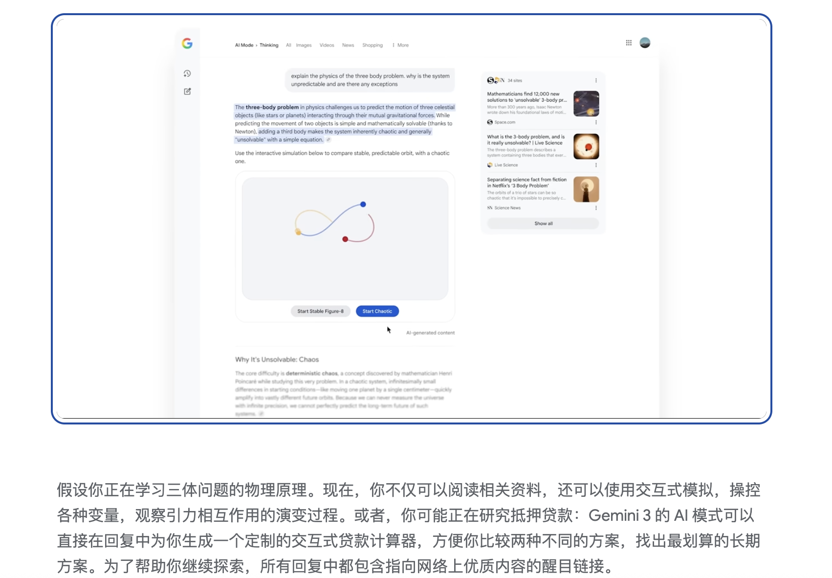 这意味着,新发布的模型已经足够成熟,能在商业化的场景中应用。官方表示,Gemini 3为搜索引擎带来了很强的推理能力,还解锁了新的生成UI体验,用户可以使用专门生成的交互式工具和模拟来获得动态视觉布局。