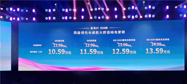 快科技11月19日消息,今日晚间,2026款东风星海S7正式上市,共推出4款车型,指导价区间为11.99-14.99万元,限时置换一口价为10.59-13.59万元。