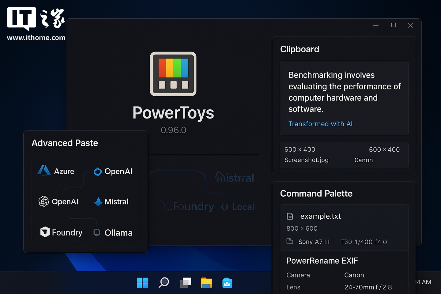 IT之家 11 月 19 日消息,微软 Win11 系统效率神器 PowerToys 现已更新 0.96 版本,更新最大亮点是高级粘贴功能支持接入自定义 AI 大模型,PowerRename 重命名工具新增 Exif 元数据提取功能,可在批量重命名时自动根据相机型号、曝光信息等信息自动排列。