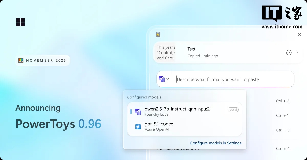 IT之家查询更新日志发现,现在 PowerToys 的高级粘贴功能允许用户连接多种 AI 大模型提供商,而不再局限于 OpenAI,目前支持 Azure OpenAI、OpenAI、Google Gemini、Mistral、Foundry Local、Ollama 等 AI 大模型,为用户提供更高灵活性。