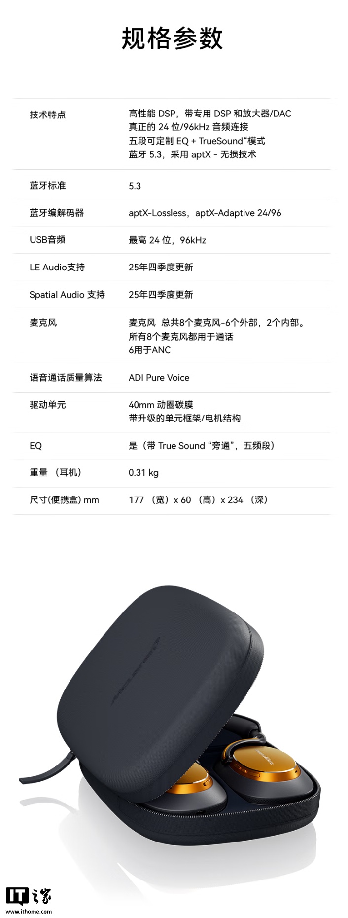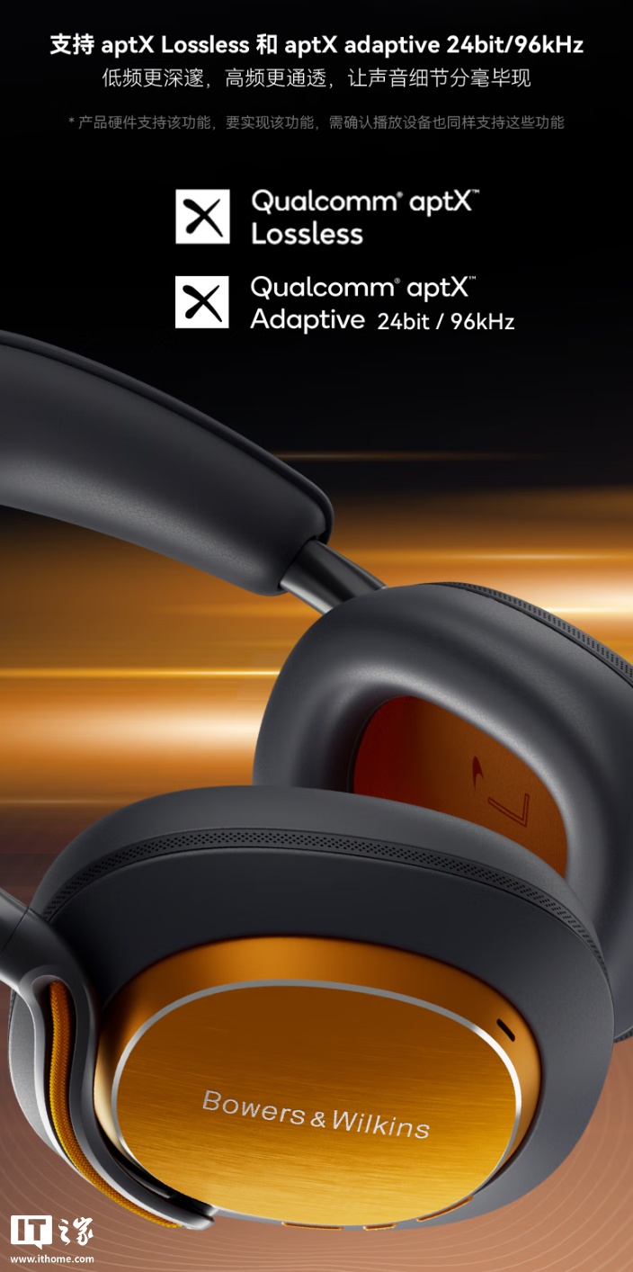 此外,这款耳机支持蓝牙 5.3 连接,支持高通 aptX Lossless 和 aptX Adaptive 24bit/96kHz 无损编解码器,配套的 Bowers&Wikins Music App 支持调整 EQ 等操作,耳机续航超 30 小时,支持 3.5mm 有线、蓝牙无线双连接模式。