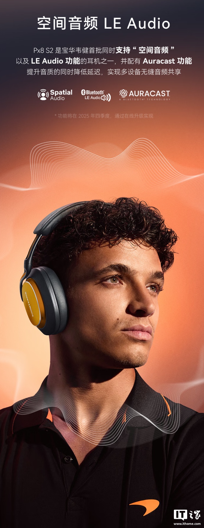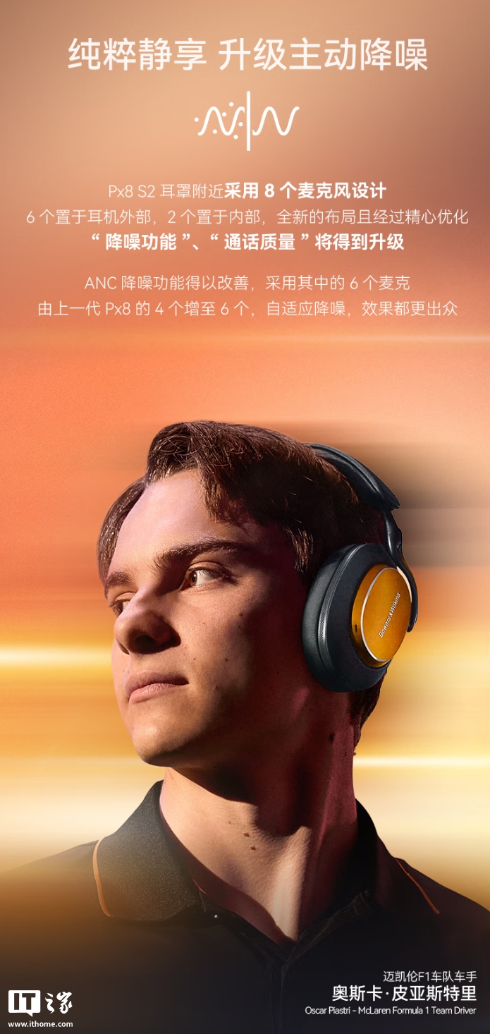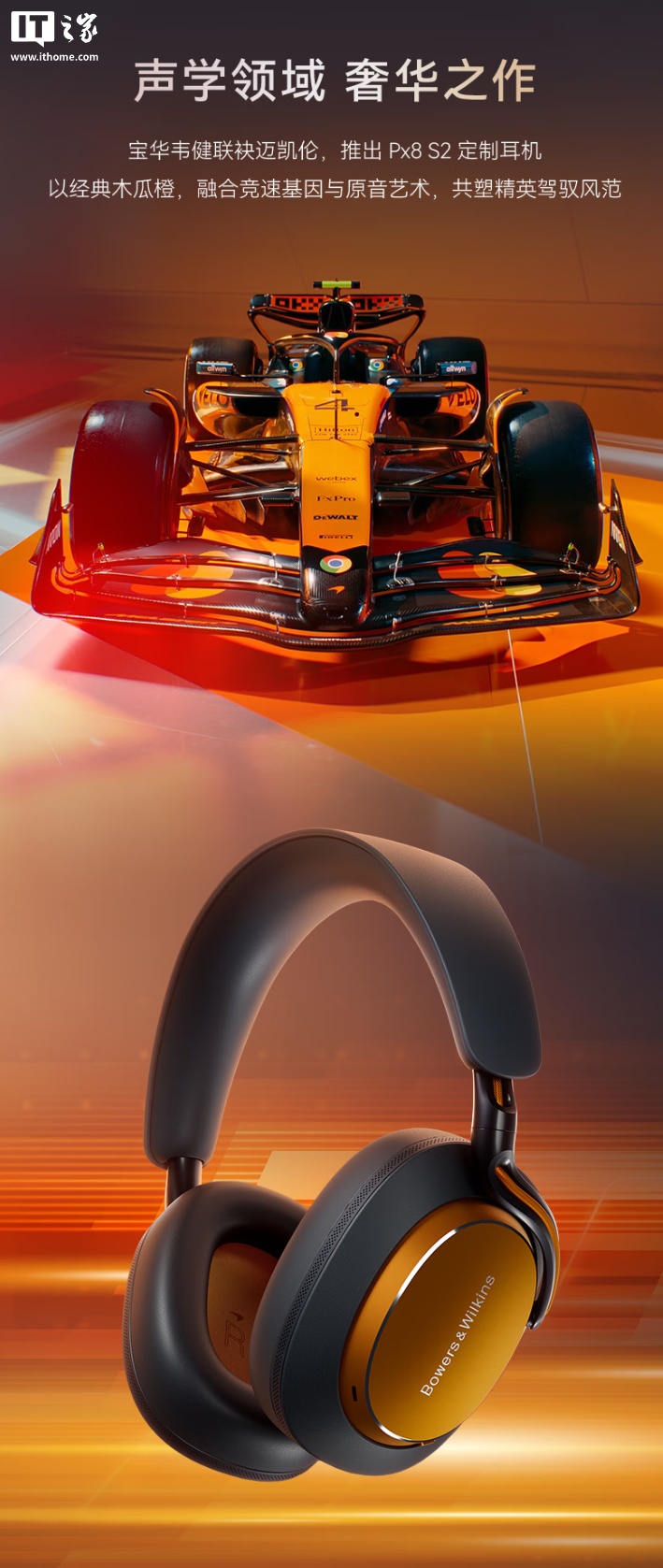 IT之家 11 月 19 日消息,宝华韦健 Px8S2 头戴耳机现已新增迈凯伦联名版,主打 F1 赛车迈凯伦车队联名配色“木瓜橙”,支持 ANC 主动降噪,拥有 Nappa 皮革,支持高通 aptX Lossless 无损音频编码器售价 7799 元