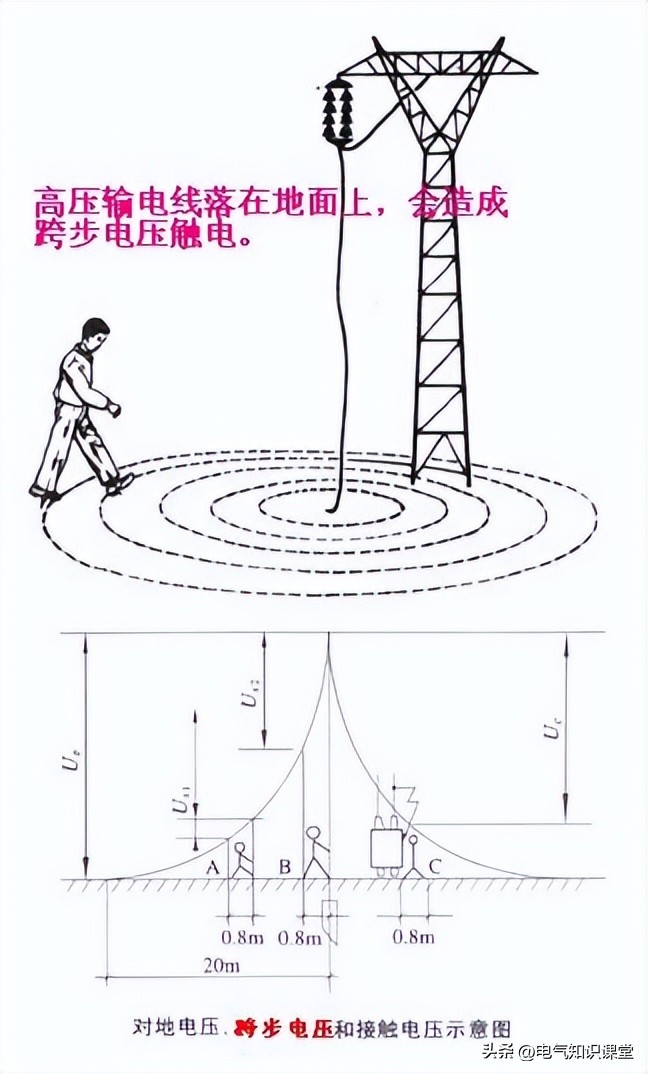 2. 跨步电压触电:当高压输电线断裂落地后,电流以落地点为中心向大地扩散,形成同心圆状的电位分布。人在附近行走时,两脚所处位置电位不同,形成跨步电压,电流经腿部流过身体,造成触电事故。