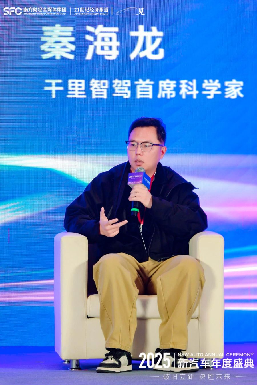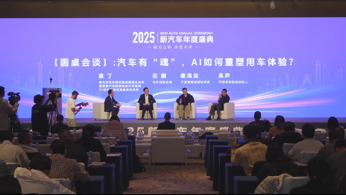 在由南方财经全媒体集团指导、21世纪经济报道主办的2025新汽车年度盛典上,南方财经全媒体集团编委会成员、集团客户端编委会执行总编辑、21世纪经济报道编委会成员袁丁主持题为《汽车有“魂”,AI如何重塑用车体验?》的圆桌论坛,邀请到地平线副总裁吕鹏、千里智驾首席科学家秦海龙和场景实验室创始人吴声三位业界专家,旨在穿透技术路线的迷雾,深入探讨AI如何超越工具属性,为汽车注入可进化、可感知的“灵魂”,从而彻底重塑人类的用车体验。