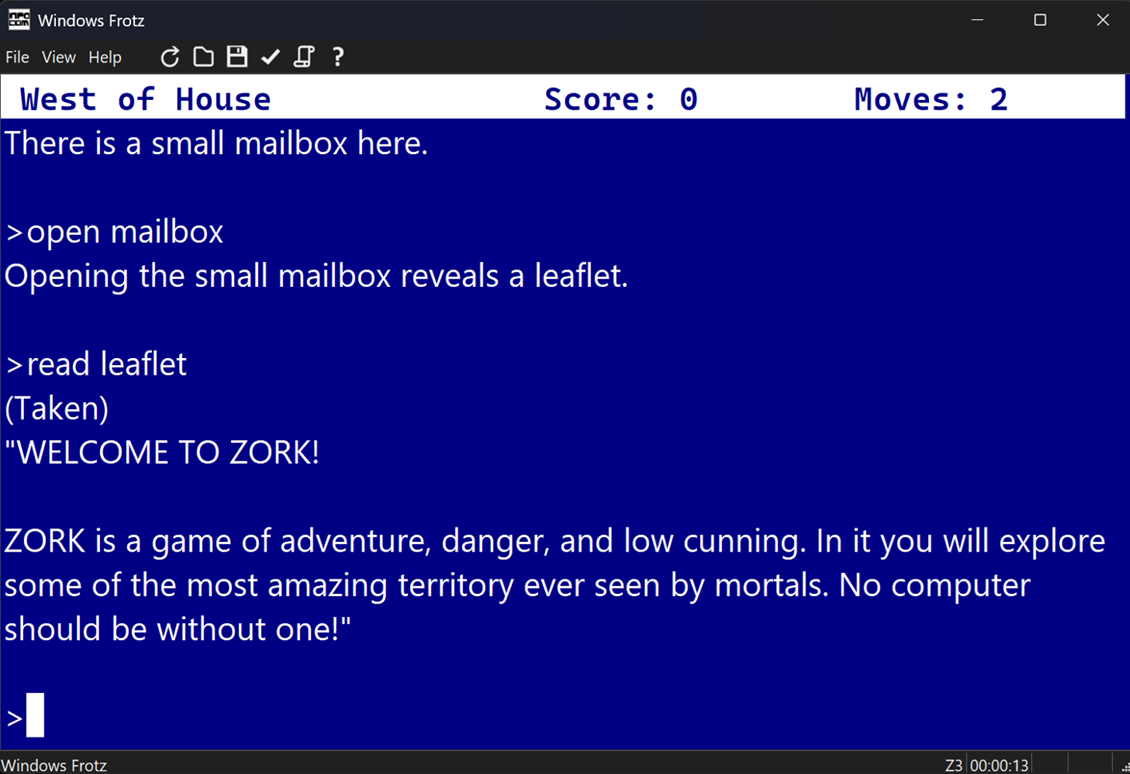 公开资料显示,《Zork》是电子游戏史上最早的一款文字冒险游戏,是 Colossal Cave Adventure 的一个早期后继。