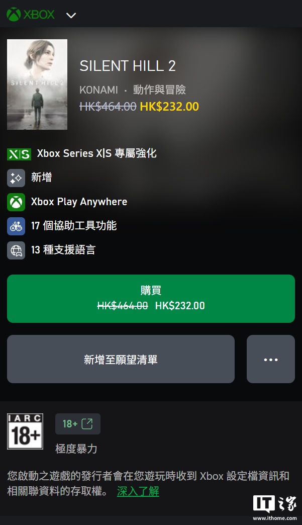 IT之家 11 月 21 日消息,科乐美《寂静岭 2:重制版》游戏现已登陆微软 Xbox Series X|S 平台,目前正进行首发半价活动,标准版售价 232 港元(IT之家注:现汇率约合 212.1 元人民币),豪华版售价 264.5 港元(现汇率约合 241.8 元人民币)。