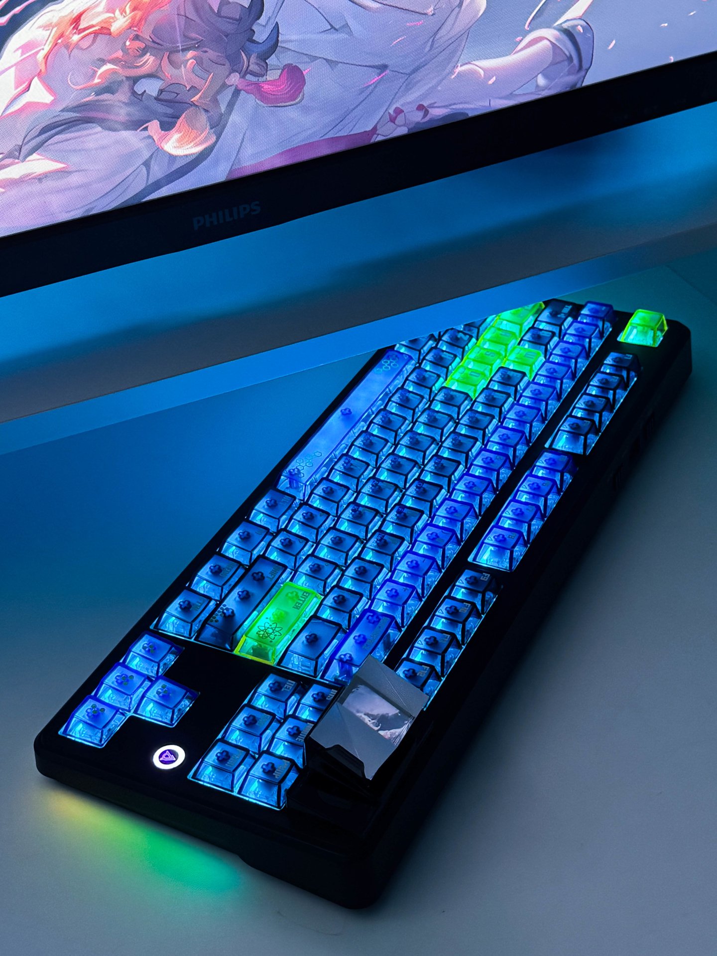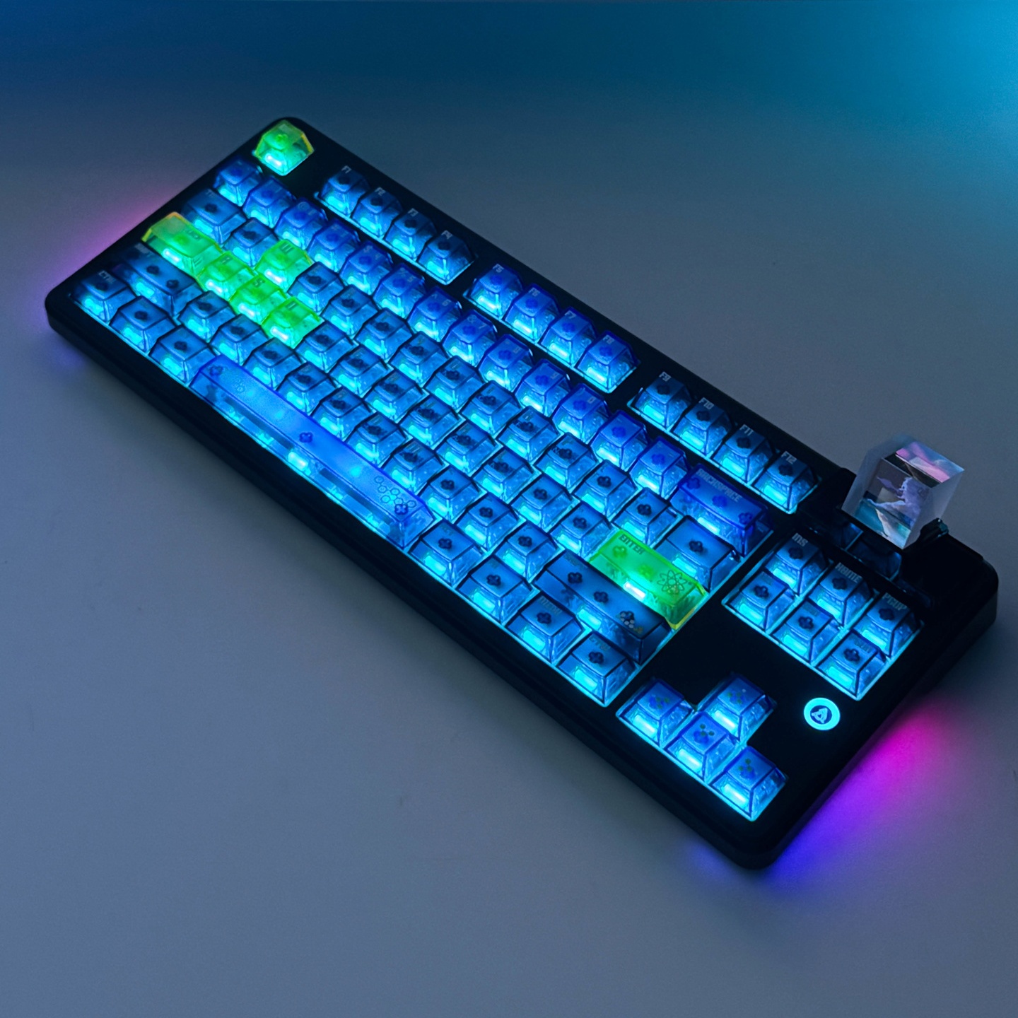 黑爵 MK87 棱镜版键盘采用 87 键 80% 配列和 Gasket 垫片固定结构;基于 1.2mm 单键开槽 PCB,支持轴体热插拔,具备 1600 万色下灯位 RGB 背光(IT之家注:空格键拥有 9 颗灯珠);拥有 4 层填充和横向开槽 PC 定位板。