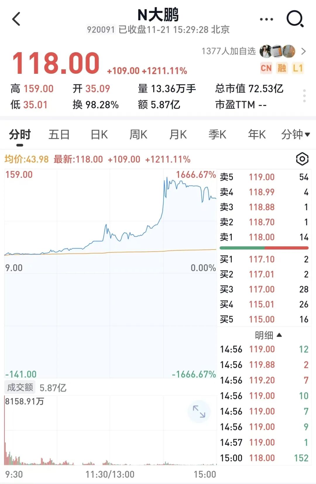 A股市场今天有一只新股上市,为大鹏工业,上午盘中该股涨幅一度超过1500%,截至收盘涨1211%,总市值72.53亿。