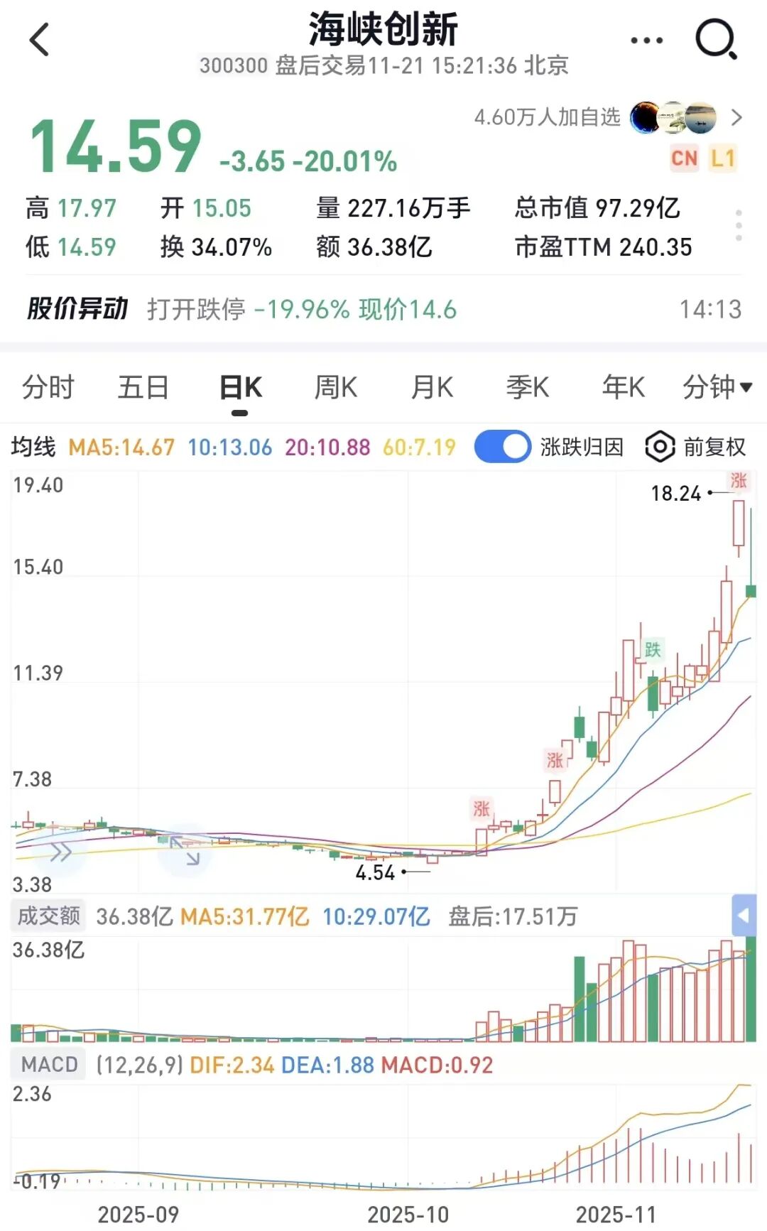 11月17日晚间,海峡创新发布股票停牌核查相关公告。公告称,海峡创新 股价自10月27日至11月17日价格涨幅为185.89%,期间于10月28日、11月4日、11月17日出现三次股价异常波动或严重异常波动,严重背离公司基本面。请投资者谨慎投资,注意炒作风险。