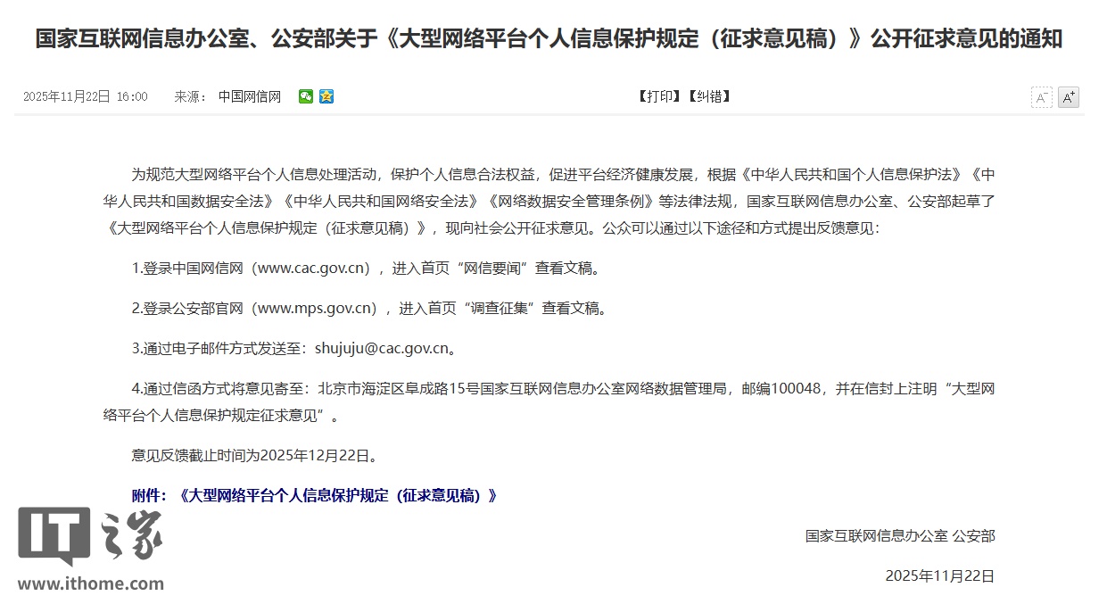 IT之家 11 月 22 日消息,为规范大型网络平台个人信息处理活动,保护个人信息合法权益,促进平台经济健康发展,根据《中华人民共和国个人信息保护法》《中华人民共和国数据安全法》《中华人民共和国网络安全法》《网络数据安全管理条例》等法律法规,国家互联网信息办公室、公安部起草了《大型网络平台个人信息保护规定(征求意见稿)》,现向社会公开征求意见。意见反馈截止时间为 2025 年 12 月 22 日。