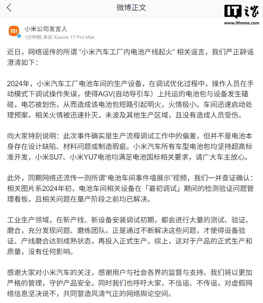 向大家特别说明:此次事件确实是生产流程调试工作中的偏差,但并不是电池本身存在设计缺陷、材料问题或制造瑕疵。小米汽车所有车型电池包均坚持超高标准开发,小米 SU7、小米 YU7 电池均满足电池国标相关要求,请广大车主放心。