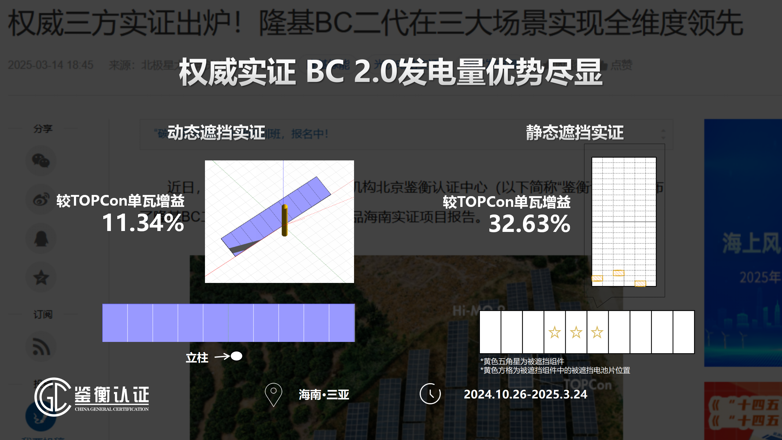 防遮挡,不只是“少损失”,更是“稳输出”。行业权威机构“鉴衡认证”历时两个多月的实证测试表明,隆基“三防组件”在模拟鸟粪、异物遮挡、风光同场阴影等多种场景下,背板平均温度较TOPCon组件低约7.43℃。更低的工作温度意味着更长的材料寿命与更高的系统可靠性,这对佛山高温高湿环境下的连续生产至关重要。其功率损失比TOPCon产品降低70%,并已获得TÜV莱茵抗阴影遮挡A级认证。