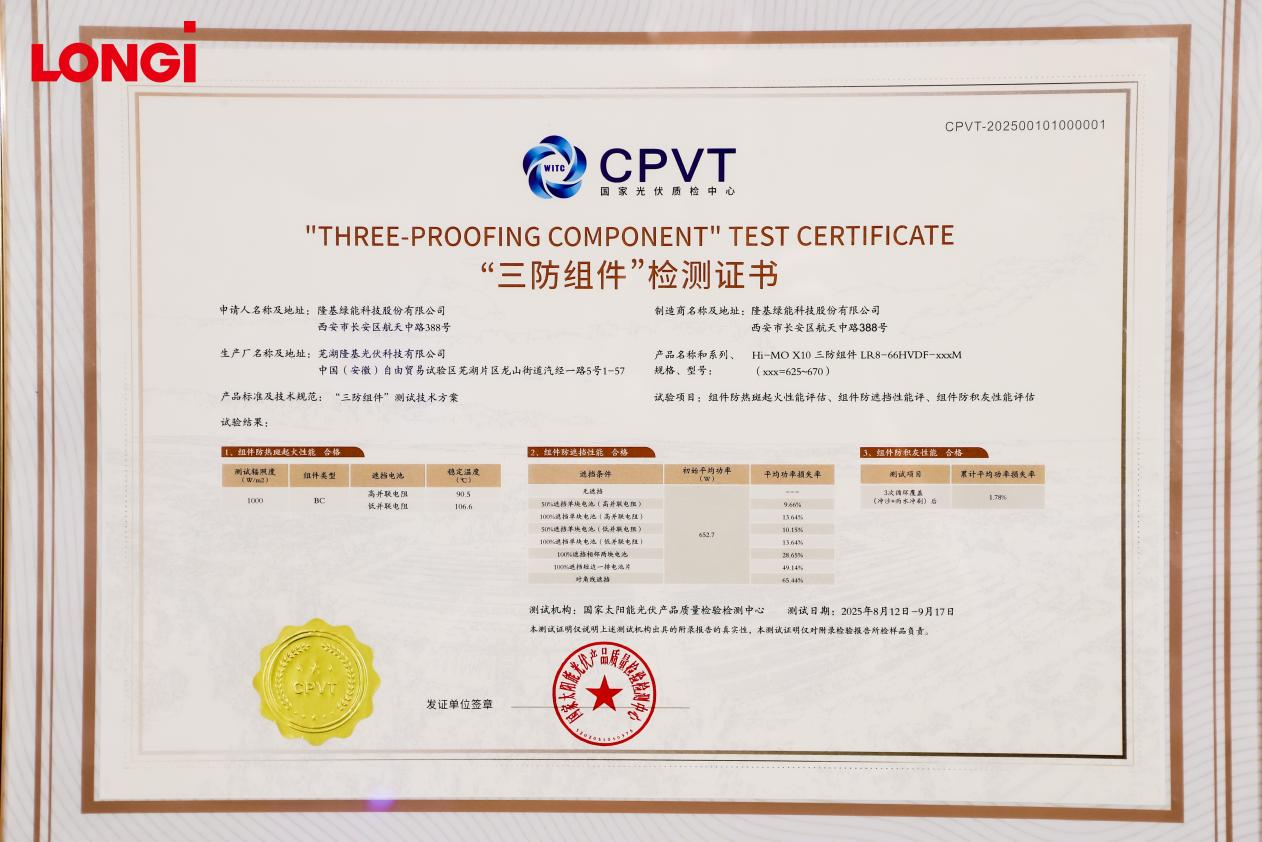 这一性能已获CPVT权威认证——隆基是目前全球唯一获得“三防组件”检测证书的企业。作为经国家批准筹建的国家级法定检验机构,CPVT的认证标准在行业内公认最高,极具公信力。