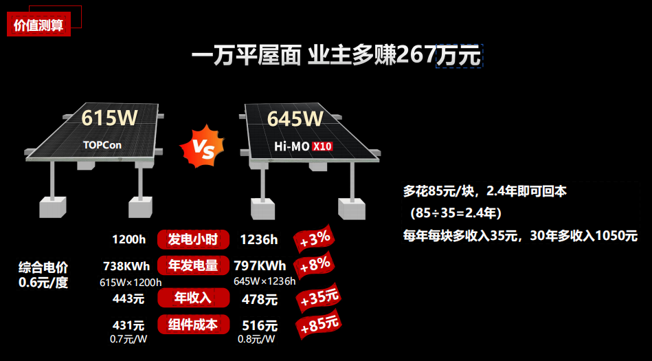 以1万平米屋顶为例,尽管X10三防组件较主流TOPCon组件每块组件贵85元,但每年能多发60度电,对业主来讲,按照综合电价0.6/度计算,2.4年即可回本;30年全生命周期可多赚约267万元。