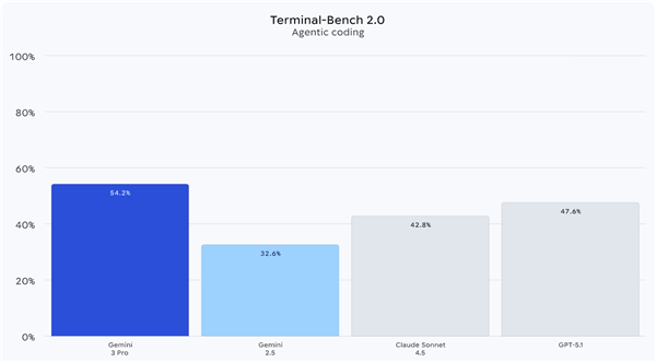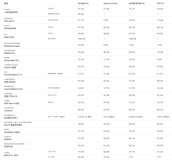 谷歌试图表达,Gemini 3 Pro 在标准化知识生成、AI工具使用乃至“人工智能”这几个重要指标方面,具有全方位的优势。