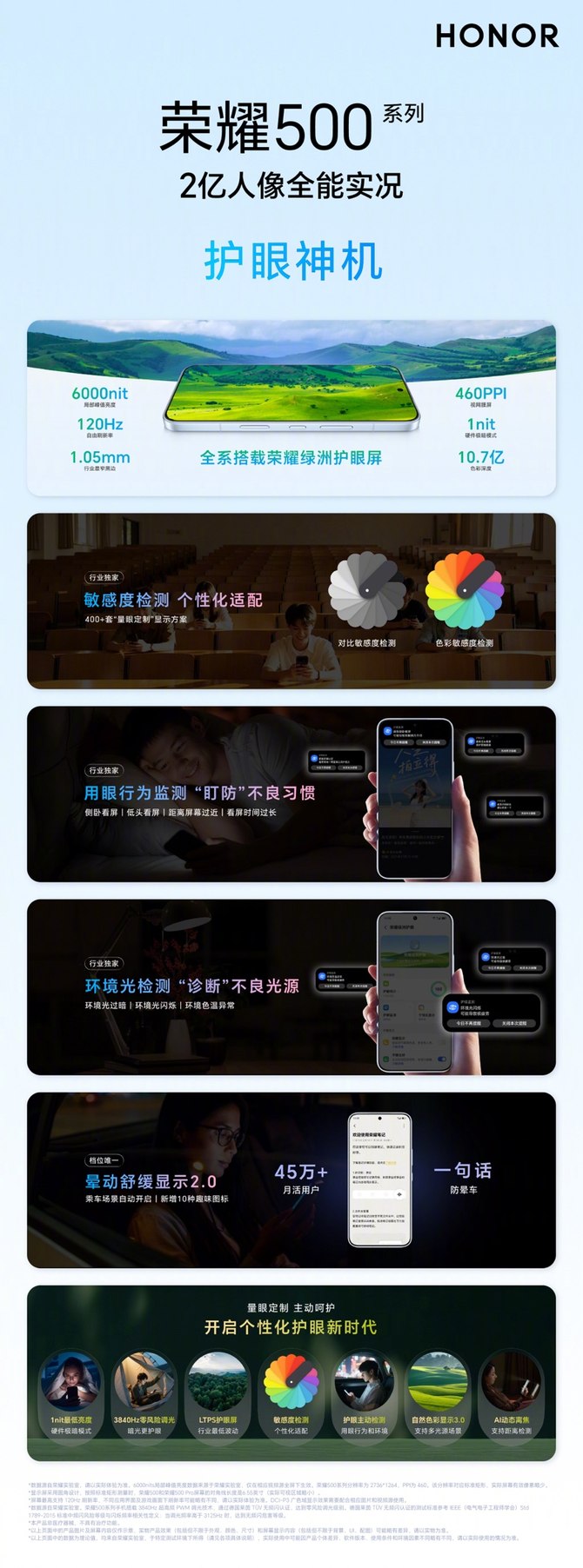 荣耀500系列全系标配6.55英寸1.5K绿洲护眼屏,凭借1.05mm“行业最窄黑边”设计,带来近乎无边框的视觉体验。屏幕PPI高达460,局部峰值亮度可达6000尼特,配合10bit色深与1尼特硬件极暗模式,无论是强光户外还是夜间使用,都能呈现细腻清晰、舒适护眼的显示效果。