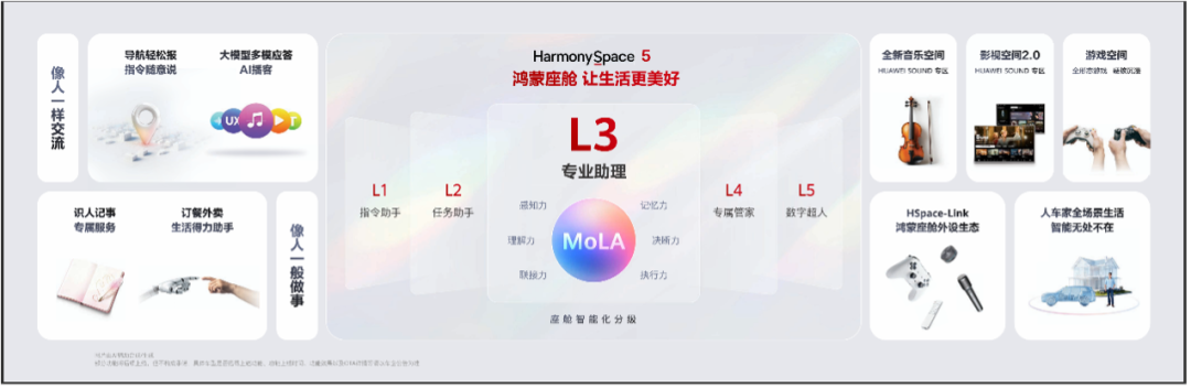 目前,鸿蒙座舱总用户数已超 130 万。随着混合大模型 MoLA 架构持续升级,它将为用户带来更好的座舱体验。本次发布会,鸿蒙座舱功能再次迎来智能体验新升级:智慧语音不仅从被动响应进阶到了主动建议,而且还具备了调用工具的功能,可实现点外卖、支付等功能。这也标志着鸿蒙座舱已率先进入 智能座舱 L3” 时代。