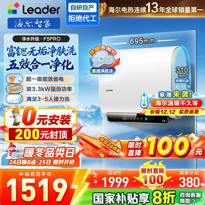 未经允许不得转载:紫竹林-程序员中文网 » 海尔60L扁桶电热水器1424元