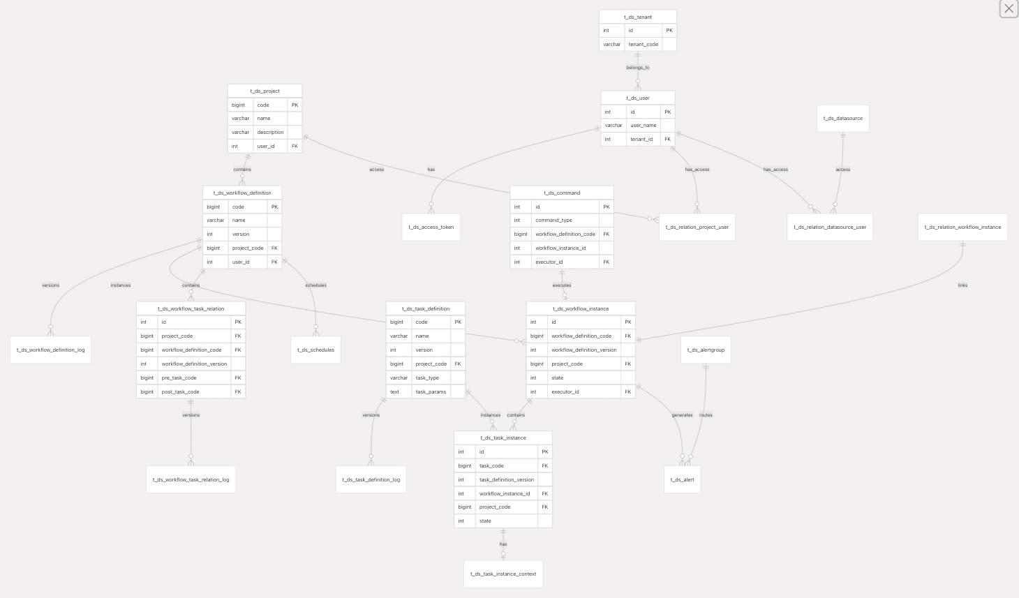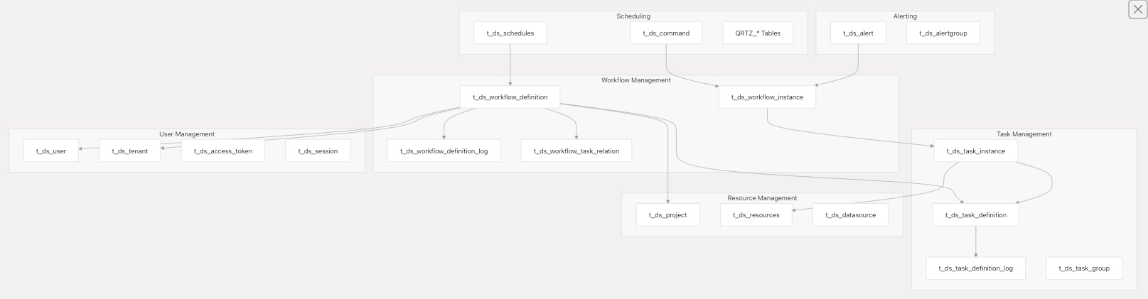本文档对 Apache DolphinScheduler 的数据库模式进行了系统介绍,涵盖存储工作流定义、任务配置、调度信息、用户数据及其他核心系统组件的各类表的结构、相互关系和功能,帮助用户深入理解 DolphinScheduler 的运行机制。