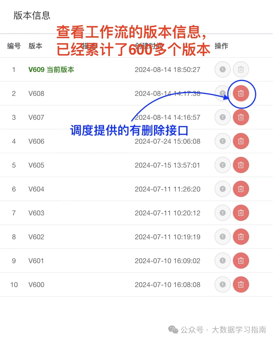 olphinScheduler 本身提供了删除版本记录的接口,请求类型:DELETE,接口地址:process-definition/{dag_code}/versions/{version} ,接口逻辑比较简单,这里就不赘述了。