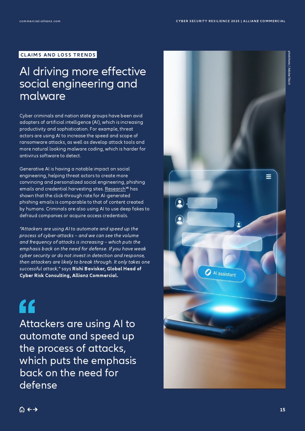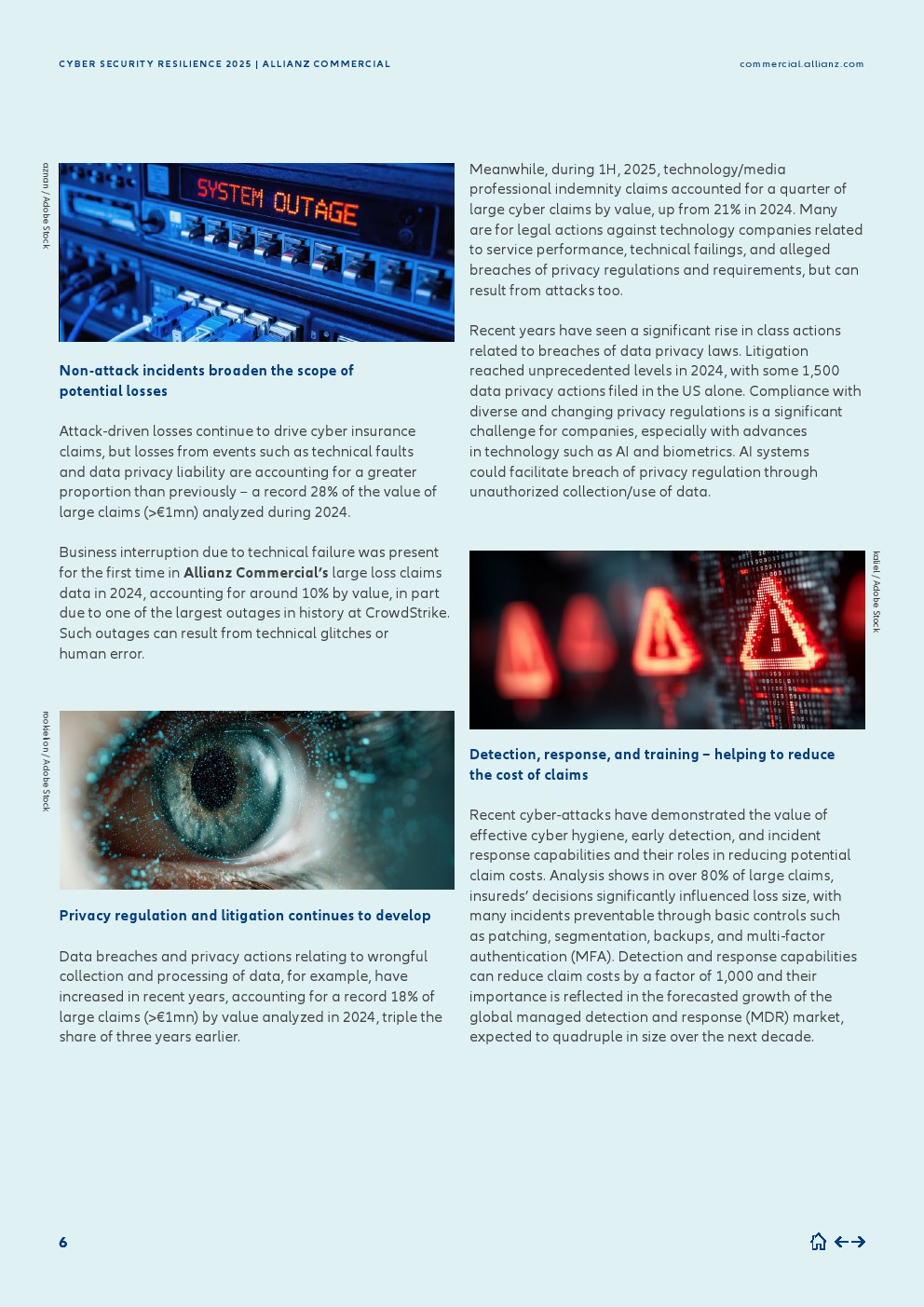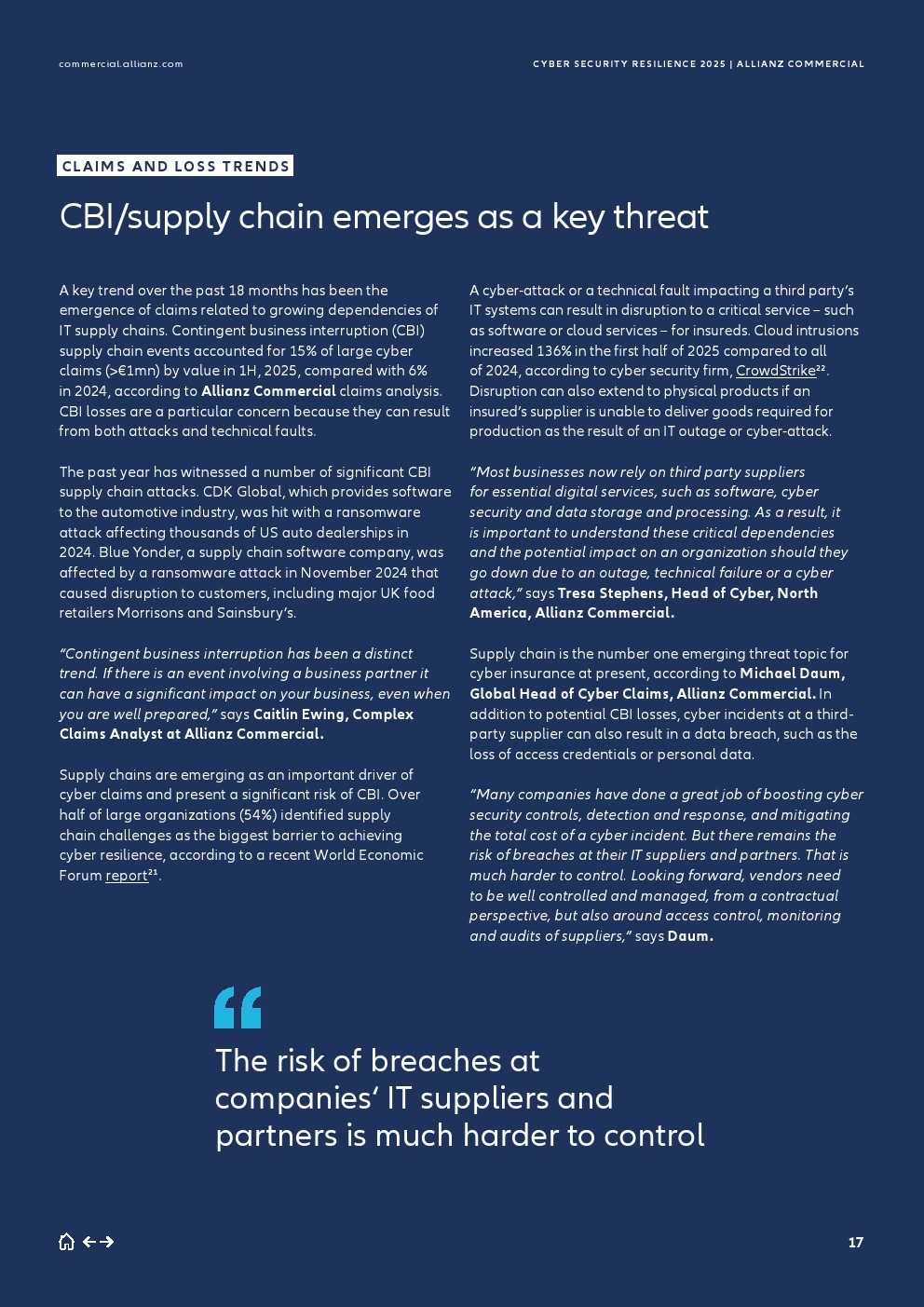 与IT供应链日益增长的依赖性相关的索赔出现,是一个关键的新兴趋势。根据安联商业的分析,在2025年上半年,或有业务中断(CBI)供应链事件按价值计算占大额网络索赔(大于100万欧元)的15%,而2024年仅为6%。