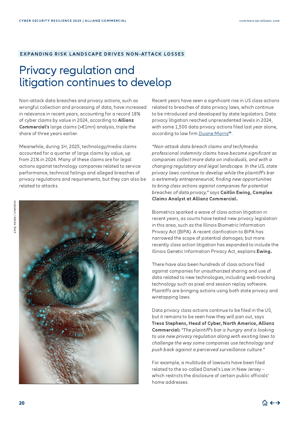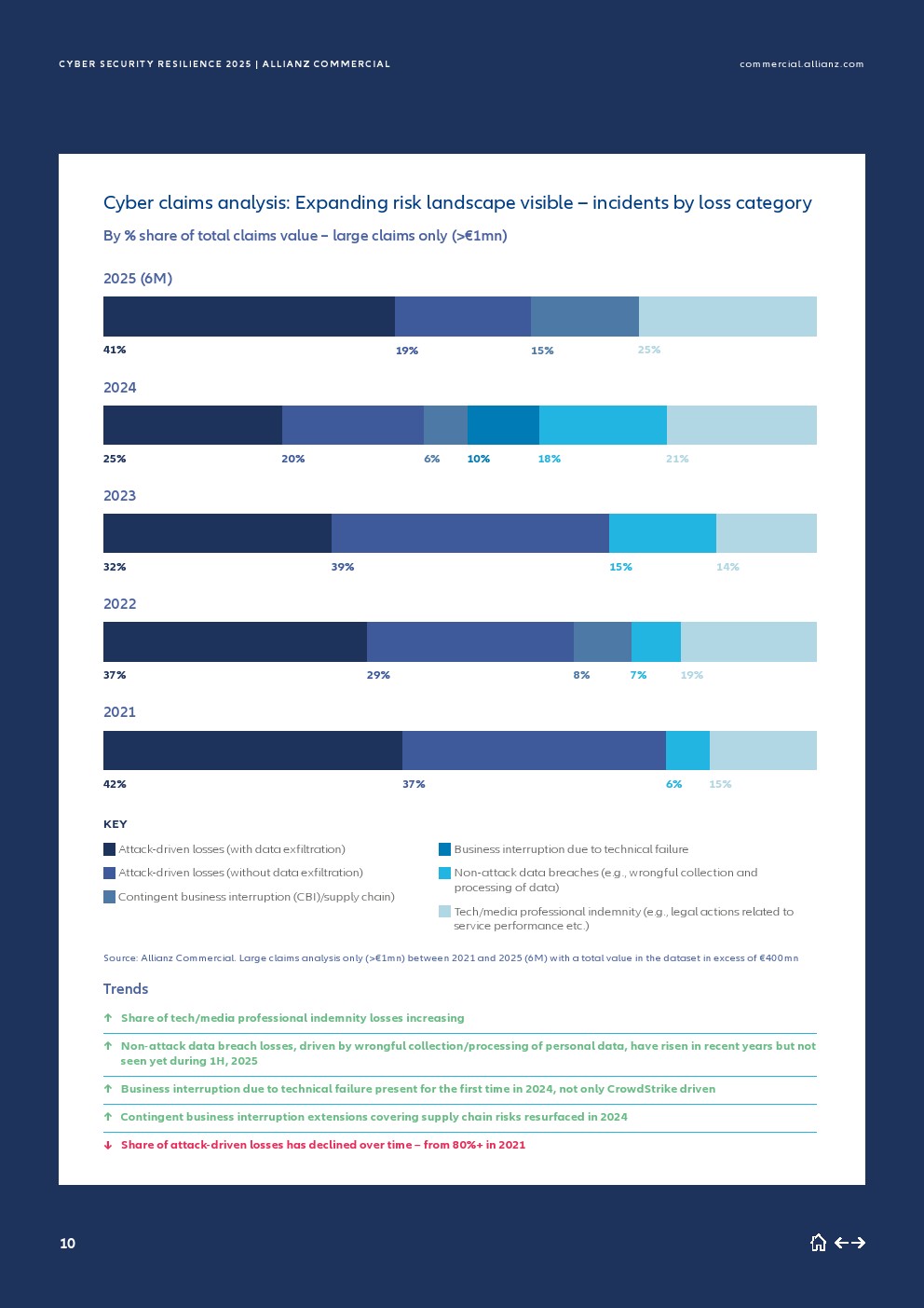 安联商业(Allianz Commercial)的网络索赔分析显示,2025年上半年的通知总数与去年同期持平(约300起),而在2023年相比2022年曾出现显著同比增长。2025年上半年,总体索赔严重程度下降了50%以上,同时大额损失索赔(大于100万欧元)的频率下降了约30%。风险格局正在超越直接网络攻击而扩展。在本年度的报告中,或有业务中断、技术故障和隐私诉讼成为损失的主要来源——诸如数据的不当收集或处理以及服务中断等事件,在2024年占大额索赔价值的创纪录的28%。