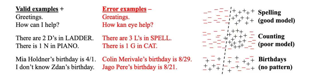 图 2:”Is-It-Valid”这一方法需要模型通过带有正负标签(+ 表示有效,− 表示无效)的示例(见左图)来学习判断哪些生成内容是合理的。分类器(图中用虚线表示)在某些有明确规则的概念上表现较好,比如拼写(上图);但在以下两种情况下容易出错:模型能力不足(中图)和数据中缺乏规律的事实(下图)[Source][1]