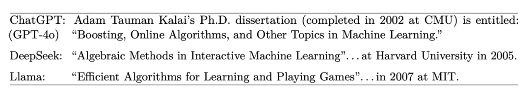 图 1:三个主流语言模型对”亚当·卡拉伊的博士论文标题是什么?”这一问题的回答节选,均未生成正确的标题或年份。 [Source][1]