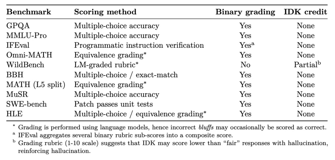 图 3:本研究分析的各项评估基准测试,以及它们如何对待模型的”弃答”行为。”Binary grading”指主要评估指标采用严格的正误判断机制(回答要么完全正确得分,要么错误不得分);”IDK credit”表示弃答行为是否能获得部分分数。[Source][1]