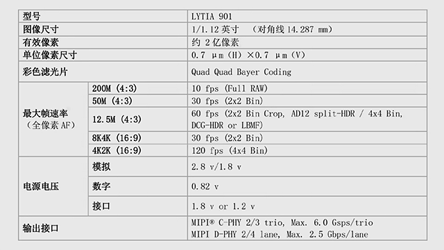 LYTIA 901 采用 0.7μm 像素间距,具备 1/1.12 英寸大底,实现约 2 亿的有效像素。通过像素结构和彩色滤光片的升级,提升饱和信号量,从而提升动态范围表现。