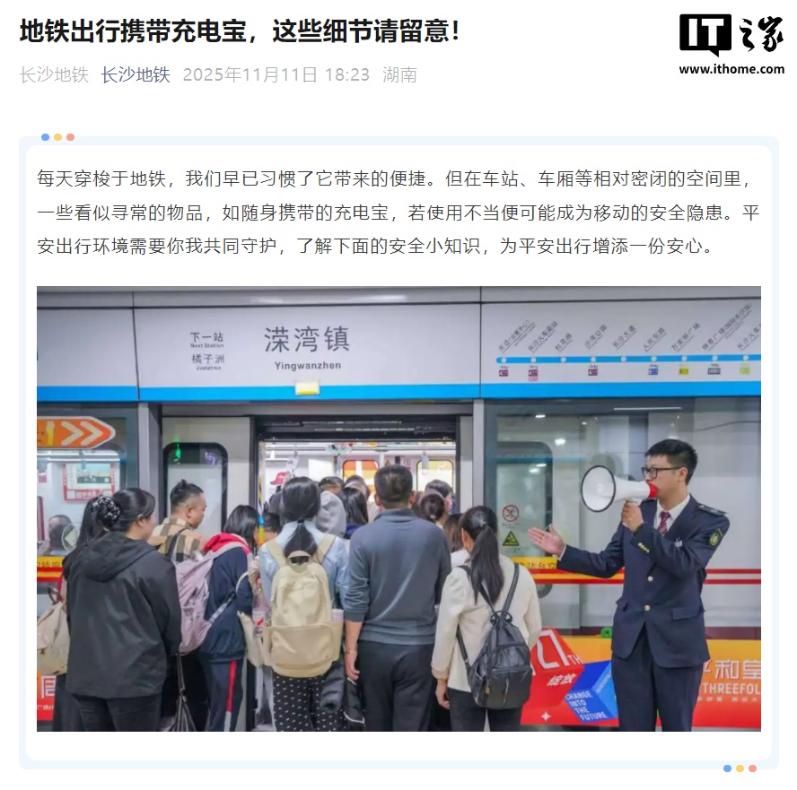 长沙地铁微信公众号 11 月 11 日发布了携带充电宝乘车的注意事项,文中提到,根据相关规定,单品锂离子电池的额定能量值不得超过 160Wh(瓦特小时)。对于符合规定的充电宝,每位乘客累计携带不得超过 3 个。此外还提到,购买充电宝时,选择正规厂家生产的充电宝,注意检查产品包装上的厂家信息、防伪码,以及 CCC 认证标志等,确保产品质量和安全性。