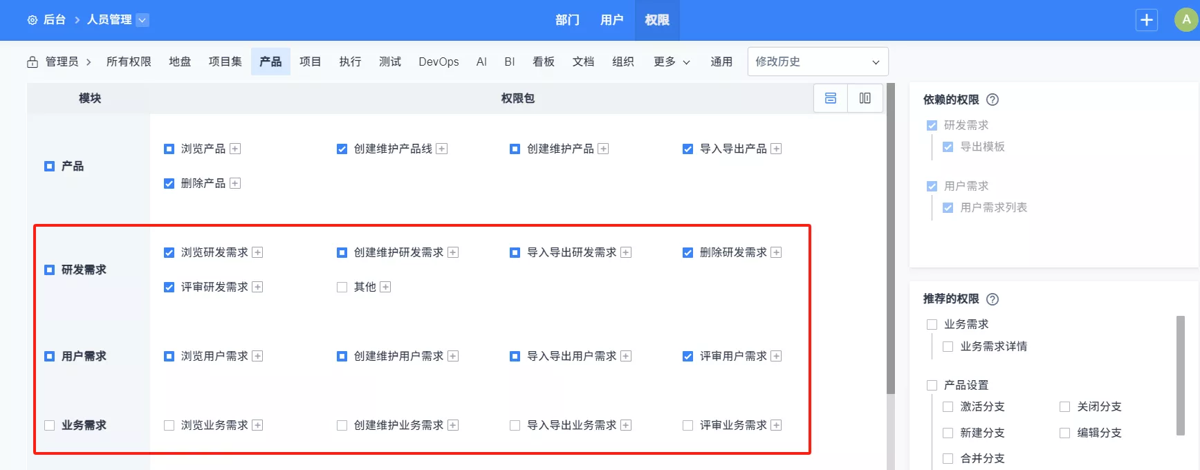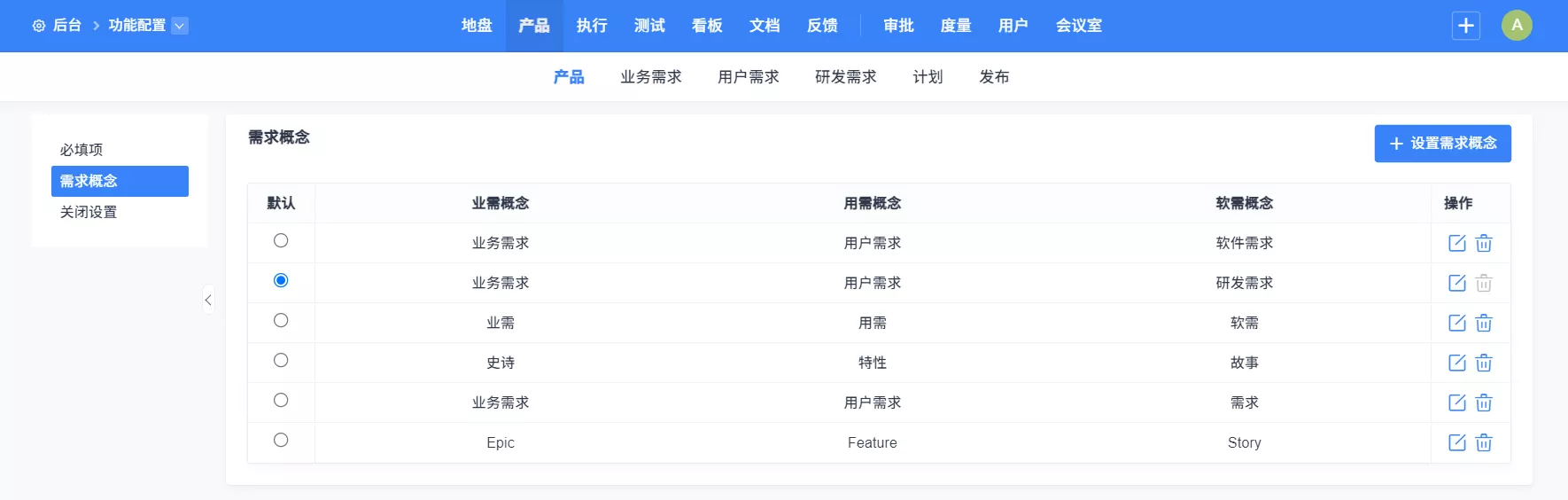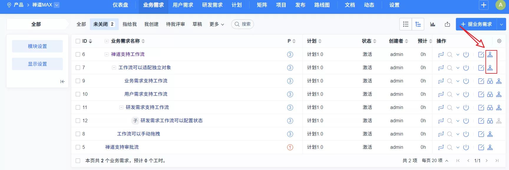 在禅道中的“产品”模块中,支持按照“业务需求——用户需求——研发需求”的三层概念进行拆分。