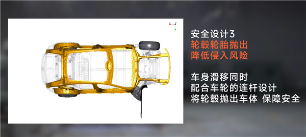 为降低乘员舱被轮毂侵入的风险,碰撞能量极大时,小米YU7在实现车体滑移的同时,配合车轮连杆设计,实现车轮旋转,将轮毂轮胎抛出车体(也就是大家俗称的“丢轮保命”,之前沃尔沃等品牌也采用类似的策略)。