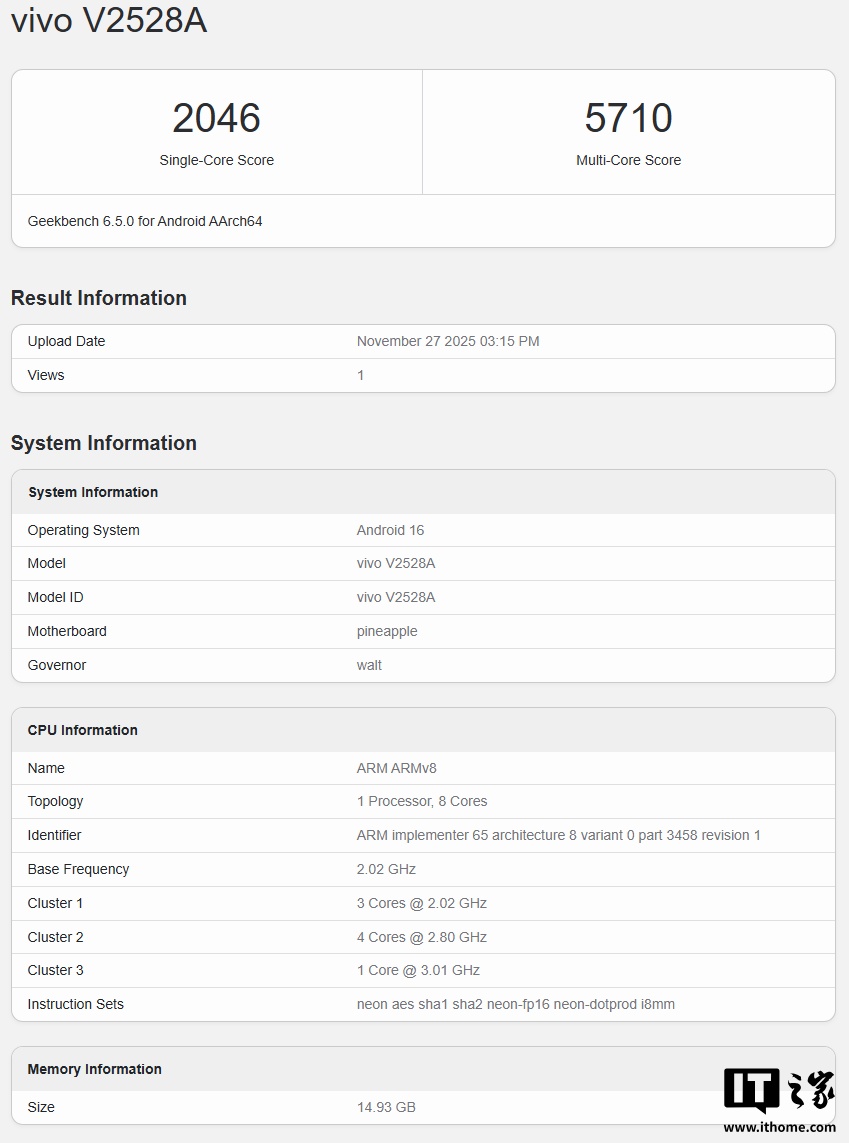 IT之家注意到,Geekbench 显示这款测试机配备 16GB 内存、Adreno 735 GPU,运行基于 Android 16 的 OriginOS 6 系统,单核 2046 分,多核 5851 分。