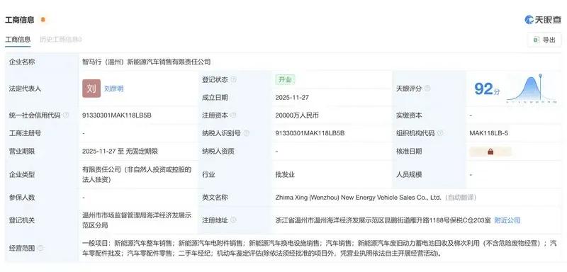 近日,据天眼查公开信息显示,智马行(温州)新能源汽车销售有限责任公司成立,法定代表人为刘彦明,注册资本20000万人民币,由威马汽车制造温州有限公司全资持股。