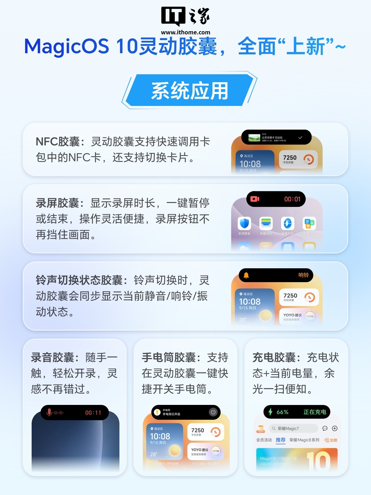 荣耀 MagicOS 10 灵动胶囊覆盖场景公布,含充电、人脸识别、NFC 刷卡等