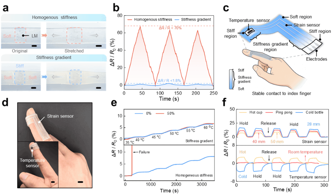 研究团队同步开发性能调控模型,实现在打印过程中对结构机械性能 10 倍、电学性能 20 倍的动态调节,成功制备出空间刚度梯度可拉伸电子器件、高灵敏度三维压力传感器及磁驱动软体机器人。