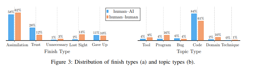 然而,这种优势在与 AI 协作时显著减弱。虽然人机团队也会交流问题和解决方案,但内容更集中于代码本身,讨论范围明显更窄。
