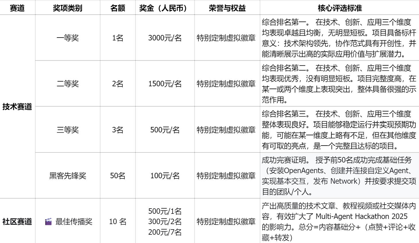 为精准激励不同特长的参与者,本次黑客松设立 “技术” 与 “社区” 双赛道。不同赛道奖项可叠加。