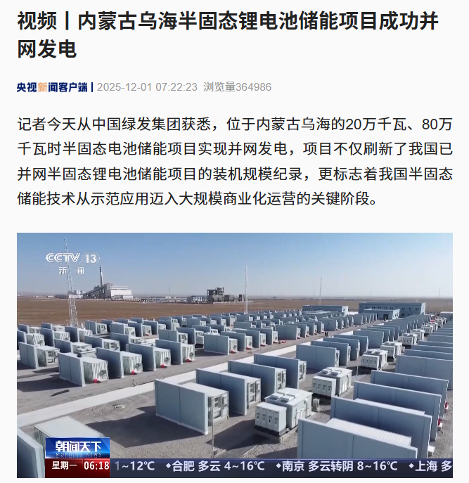 IT之家 12 月 1 日消息,据央视新闻今日报道,位于内蒙古乌海的 20 万千瓦、80 万千瓦时半固态电池储能项目实现并网发电。项目刷新了我国已并网半固态锂电池储能项目的装机规模纪录,标志着我国半固态储能技术从示范应用迈入大规模商业化运营的关键阶段。