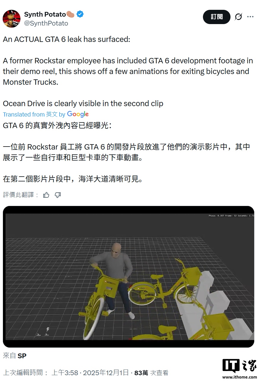 IT之家 12 月 1 日消息,知名爆料人 Synth Potato 今天在 X 平台发布了一段泄露视频,展示《GTA6》游戏的开发片段。