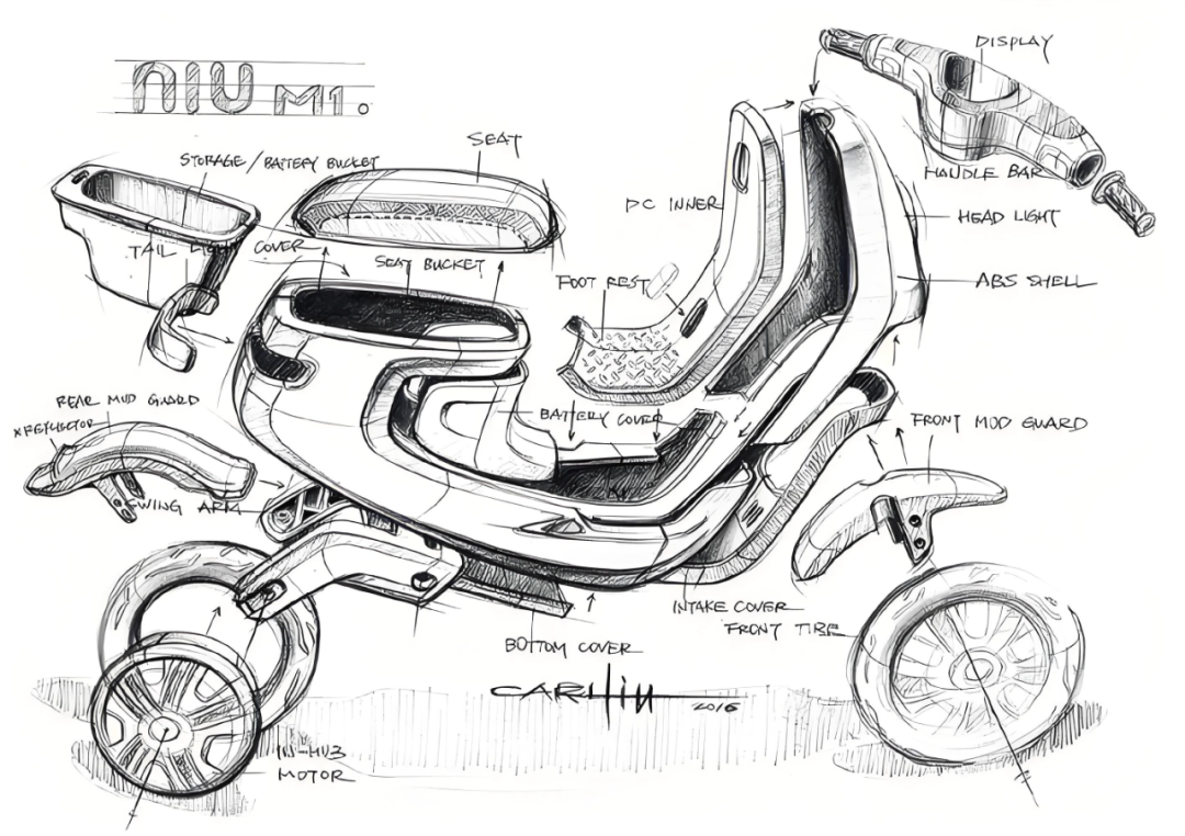 一男是行业里公认的技术大牛, 依林 带着他手绘的电动车设计图。