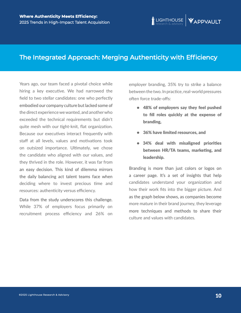 从雇主端看,优先级冲突是核心挑战。37%的雇主专注于招聘流程效率,26%聚焦雇主品牌建设,仅35%试图平衡两者。这种分散的战略导向反映在三个具体压力上:48%的雇主承认为抢速度而牺牲品牌形象,36%面临资源限制,34%遭遇人力资源与市场部门的目标不一致。