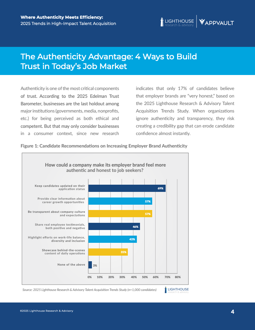 求职者对提升雇主品牌真实性的建议高度集中。其中70%的候选人希望公司及时更新其应聘状态,57%期待企业透明沟通文化与期望,57%希望看到员工真实案例与幕后故事。这些比例远高于传统品牌营销手段,反映出当代求职者更看重具体行动而非华丽宣传。