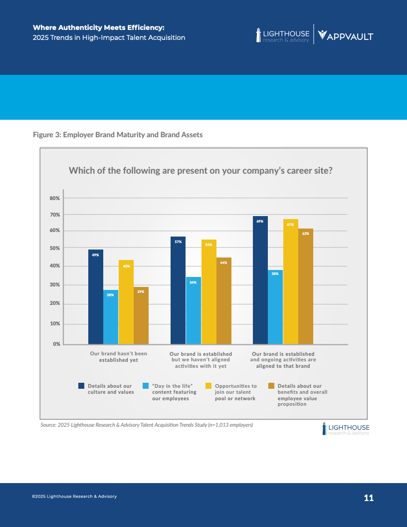 企业招聘品牌的成熟度与投入资源呈正相关。随着品牌从”未建立”演进至”已建立并持续对齐活动”,企业在职业页面上展示的内容类型与深度显著增加,这标志着从被动招聘向战略性人才品牌建设的转变。
